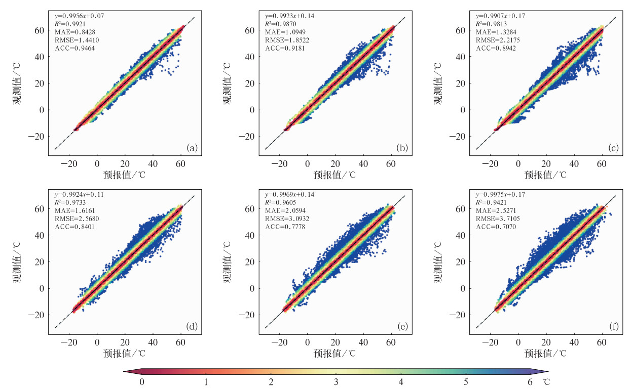 图 4 2023年交通气象站(a~c)A1和(d~f)A8模型预报值与观测值散点分布(a,d)1 h预报,(b,e)2 h预报,(c,f)3 h预报 注:虚线为1:1线;填色为预报与观测的差值,即预报误差。 Fig. 4 Scatter distribution of observation and forecast of traffic meteorological stations (a-c) A1 and (d-f) A8 models in 2023 (a, d) 1 h forecast, (b, e) 2 h forecast, (c, f) 3 h forecast |