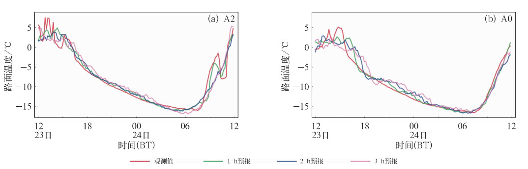 图 5 2023年1月23—24日(a)A2和(b)A0交通气象站极端低温个例的路面温度观测值与模型预报值 Fig. 5 Comparison between observation and model forecasts of extreme low pavement temperatures of traffic meteorological stations (a) A2 and (b) A0 in 23-24 January 2023 |