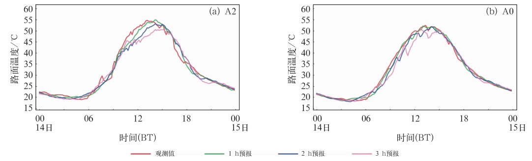 2.2.2 路面极端低温和极端高温个例的模型预报能力评估为了进一步验证模型对路面极端温度的预报效果,本文从测试集中挑选无缺测数据且出现符合2.2.1节阈值规定温度的个例进行预报效果评估。考虑数据完整度和质量控制情况,最终筛选A2和A0交通气象站模型进行个例评估。极端低温个例为2023年1月23日12时至24日12时,当日无降水,A2和A0的平均最低气温分别为-12.3℃、-13.1℃,路面温度最低分别为-15.8℃、-16.6℃;极端高温个例为2023年5月14日00时至15日00时,当日无降水,A2和A0的平均最高气温分别为35.4℃、34.5℃,路面温度最高分别为54.7℃、52.4℃。评估效果具体见表 2。