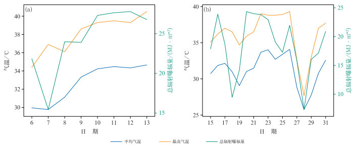 图 1 洪湖市大同湖农场(a)2022年7月6—13日, (b)2024年8月15—31日气温及太阳总辐射曝辐量 Fig. 1 Temperature and total solar radiation irradiance from (a) 6 to 13 July 2022, and (b) 15 to 31 August 2024 in Datonghu Farm of Honghu City |