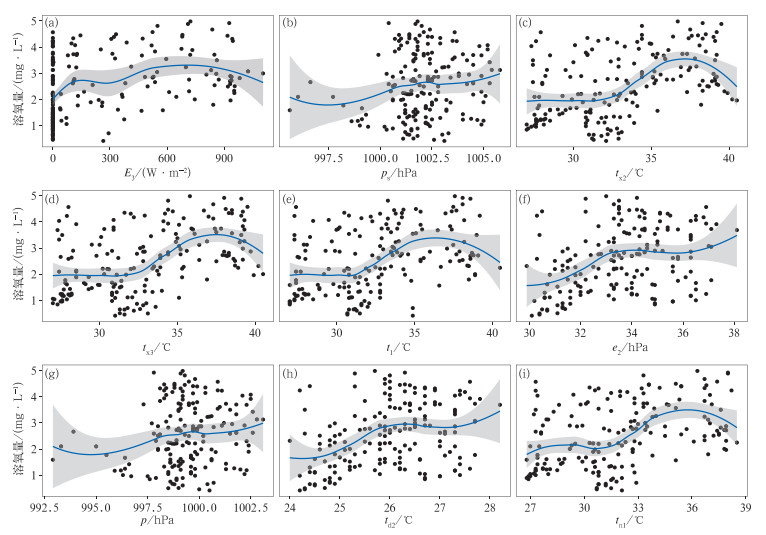 图 4 重要性评分位列前9的气象因子与池塘溶氧量的偏依赖关系 注:曲线为局部加权多项式回归拟合线,阴影为95%置信区间。 Fig. 4 Partial dependence plots between the top nine meteorological factors by VIM and the dissolved oxygen in ponds |