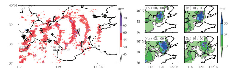 图 2 2021年(a)7月31日至8月1日雷达组合反射率因子(填色)和地面最大风速(风羽),(b)8月1日GPM观测的小时降水量(填色)演变 Fig. 2 Evolution of (a) radar composite reflectivity factor (colored) and surface maximum wind speed (barb) from 31 July to 1 August, (b) hourly precipitation (colored) observed by GPM on 1 August 2021 |