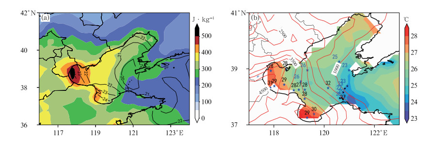 图 4 (a) 2011—2020年月平均CAPE(填色)和SST(等值线,单位:℃),(b)2021年7月31日20:00 CAPE(等值线,单位:J·kg-1)、SST(填色)和海上观测站气温(数字,单位:℃) 注:图b中五角星为海上观测站点。 Fig. 4 (a) Monthly mean CAPE (colored) and SST (contour, unit: ℃) from 2011 to 2020, (b) CAPE (contour, unit: J·kg-1), SST (colored) and temperature (number, unit: ℃) at the sea observation station at 20:00 BT 31 July 2021 |
