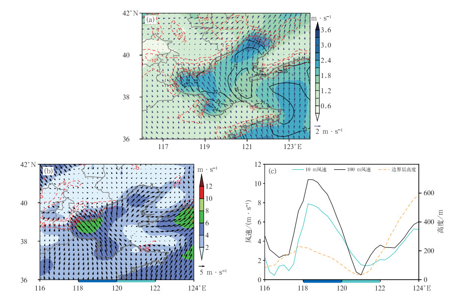 图 5 (a) 2011—2020年月平均SST(黑线,单位:℃)、10 m风场(风矢)、风速(填色)和地面散度(红虚线,单位:10-5 s-1),(b, c)2021年7月31日20:00 (b)10 m风场(风矢)、风速(填色)和地面散度(红虚线,单位:10-5 s-1),(c) 10 m、100 m风速和边界层高度沿38.5 °N的纬向变化 注:图b, c中横坐标轴上的深蓝色、浅蓝色线段分别代表对流增强、减弱区域。 Fig. 5 (a) Monthly mean SST (black line, unit: ℃), 10 m wind field (vector), wind speed (colored), and surface divergence (red dashed line, unit: 10-5 s-1) from 2011 to 2020, (b) 10 m wind field (vector), wind speed (colored), and surface divergence (red dashed line, unit: 10-5 s-1), and (c) zonal variation of 10 m, 100 m wind speeds and boundary layer height along 38.5 ° N at 20:00 BT 31 July 2021 |