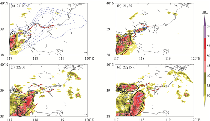 从图 6地面自动站加密风场可见,渤海湾沿岸环境风主要为东南风,风速较弱,与图 5b中ERA5再分析格点风场基本一致。受渤海湾海陆摩擦及海岸线曲率影响,海陆沿岸向岸风一侧形成了多支中尺度辐合线,对流风暴A自陆上东移,风暴出流与环境气流对峙,形成南北向辐合线并持续东移,风暴整体沿着辐合线向东传播。7月31日21:00,边界层散度辐合区相较于20:00(图 5b)略有东移(图 6a),强辐合区位于河北沧州经渤海湾延伸至唐山一带,风暴A在沧州境内发展东移,东南风遇塘沽沿岸地形形成了两支辐合线,其中辐合线1触发了风暴B(图 6b)。22:00,风暴A入海受沿岸南侧辐合线2抬升影响,发展加强, 并在辐合线2附近演变成弓形回波(图 6c)。22:15,风暴A与风暴B合并发展形成了线性风暴,回波强度进一步加强,最大反射率因子达65 dBz(图 6d)。同时,陆上对流冷池前沿的偏南气流与塘沽沿岸的偏东气流辐合加强,触发了多个雷暴单体,进而演化成了东西带状的多单体风暴C。随后,风暴A和C合并形成弓形飑线(图略)。飑线自渤海湾入海快速组织化发展,组织化发展区与高CAPE值及散度辐合区相对应(图 4,图 5)。
