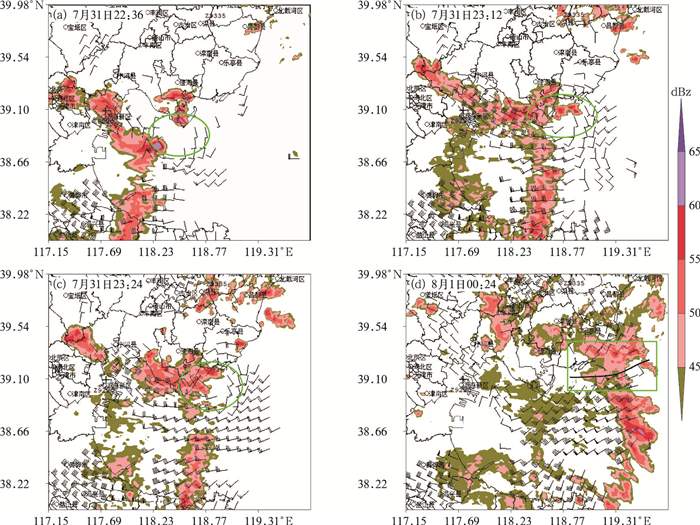 图 7 2021年7月31日至8月1日雷达组合反射率因子(填色)和300 m反演风场(风羽) 注:绿圈代表中尺度涡旋区,绿框代表切变线影响区,黑色粗实线代表切变线。 Fig. 7 Radar composite reflectivity factor (colored) and 300 m wind field (barb) retrieved by radar from 31 July to 1 August 2021 |