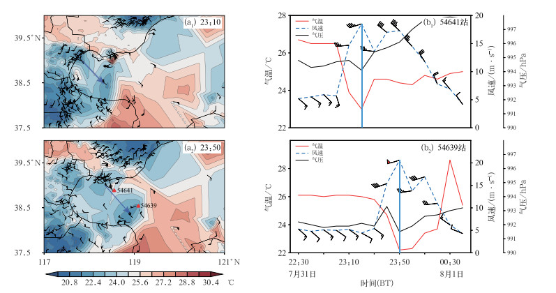 一般认为强冷池密度流在弓形飑线的发展中起着重要作用(王秀明等,2012)。邓承之等(2024)分析了一次西南低涡影响下的飑线过程,发现“人字形”回波后部边界层内由前期暴雨形成的冷区在冷锋南下和锋后干空气中的雨滴蒸发冷却作用下进一步降温加强冷池出流,有利于弓形飑线的形成。此次过程也表现有类似特征,图 7显示“人字形”回波在渤海湾北侧沿岸的近地面反演风场中主要呈现为西北风,而其海上一侧则主要表现为偏西风或西南风,随着沿岸对流的发展,海上偏西风风速明显增大。结合地面加密自动站温度和风场分析发现,沿岸对流冷池出流向海传播,有利于海上对流冷池强度以及地面风速的增大。从图 8a可见,7月31日23:10,塘沽北侧沿岸对流的冷池出流方向指向东南侧,冷池出流走向与沿岸的西北气流方向一致;23:12,唐海县沿岸地区对流活动显著增强(图 7b),随着西北风风速的增强和冷池的向海传播,海上自动站监测气温持续下降,且风速明显增大。沿岸站点和海上站点气象要素时序图呈现出更为显著的变化特征(图 8b),23:20,沿岸站点的对流活动发展加强,气温随之下降至23℃,随后,风向由偏西风转变为西北风(图 8b1),这一风向变化有利于地面冷池向海域方向流动,并逐渐对海上站点产生影响,海上站点气温自23:20持续下降,直至23:50,气温降至最低值20.8℃,同时地面偏西风风速增大至20 m·s-1(图 8b2)。海面冷池强度的加强及偏西风的增大,有利于飑线向东传播并发展,从8月1日00:24组合反射率因子(图 7d)可见,海上组合反射率因子相较于前期出现了显著增强,最大反射率因子达到了60 dBz,飑线的组织结构也显著增强,其后紧跟着一个风速超过20 m·s-1的强风区。