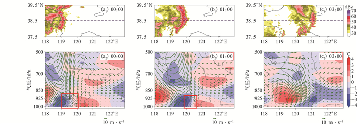 飑线的组织化过程往往呈现出两支强入流为典型特征的动力结构: 一支位于雷暴冷池后侧中层(4500~5000 m), 另一支位于低层飑线前侧, 由强辐合区垂直于飑线指向云内,后侧入流和前侧入流同时加强有利于飑线前侧垂直环流发展(雷蕾等,2021)。图 9详细展示了海上飑线自西向东的移动过程及其对应时间过38.5°N的u-w环流、气温与同纬度平均气温的差值及锋生特征。具体而言,8月1日00:00,海上飑线已移至渤海湾东部(图 9a1),即渤海入口处,此时,沿岸的对流活动带来了海上飑线的冷池密度流加强,与环境气流势力相当,飑线后侧的入流急流、冷池出流以及前侧低层入流在飑线前侧汇聚(图 9a2红色方框),冷池与暖水区上空的暖温区形成的边界层锋生显著,上升气流发展明显。01:00,飑线东移进入渤海区域,飑线发展加强呈现出典型的弓形结构特征(图 9b1),后侧入流急流、冷池强度相较于上个时次发展加强,然而受飑线前侧低层入流以及环境温度减弱影响,飑线前缘的锋生强度有所减弱,对应上升运动减弱(图 9b2)。03:00,飑线已完全移出渤海进入渤海海峡冷水区(图 9c1),整个边界层基本为冷空气所主导,近地面入流气流及环境暖空气已不再显著,上升运动不再明显,近地面锋生现象消失,后侧中空急流、飑线强度和组织化程度明显减弱(图 9c2)。可见,在海上飑线加强过程中,边界层锋生发挥着至关重要的作用,其中边界层气温和环境气流的变化影响较为显著,而前文分析的边界层气温和风场又受海温的影响较大,最终使得飑线在渤海暖水区发展加强,在冷水区减弱消散。