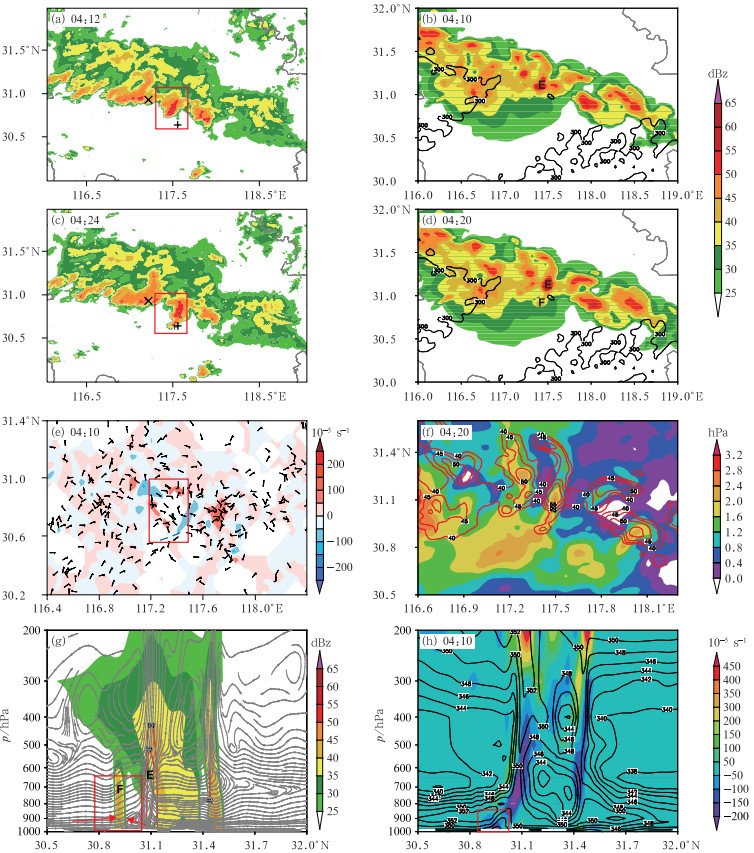 雷暴高压发展到一定程度,其下沉气流在近地面会形成出流,近地面出流与合适的环境风场之间又会形成强烈的辐合,进而触发新的对流。5月27日04:12,实况30.7°~31.0°N、117.5°E附近短对流1正在强烈发展(图 10a中红框处),对应临近时刻地面图上为辐散气流区, 其中向南的一支偏北风气流与环境的偏南风之间形成了一条地面辐合线(图 10e)。04:24,原地面辐合线附近有新的对流强烈发展与原短对流相接(图 10c)。模拟结果同样显示:04:10左右,短对流1的线状结构已经形成,回波强度呈现南强北弱的特征,南侧的对流单体E中心强度超过55 dBz(图 10b),04:20单体E南部出现新生单体F,导致短对流南北尺度增加(图 10d)。单体E对单体F有触发作用,从04:20前1 h变压可以看出:单体E附近出现明显的正变压,1 h变压中心超过2.4 hPa,表明单体E强烈发展过程中在近地面附近形成明显的雷暴出流(图 10f)。经117.4°E (图 10b中单体E)作垂直剖面,04:10 31.1°N附近对流单体E强烈发展,超过50 dBz的回波发展到接近400 hPa的高度,其低层700 hPa以下为一致的下沉气流(图 10g),下沉气流在900 hPa附近向南北两个方向辐散,形成雷暴高压,其中向南的一支气流与环境的东南风在低层形成强烈的辐合(图 10h),造成04:20在对流单体E南侧触发对流单体F,这是短对流线性发展的一个重要原因。