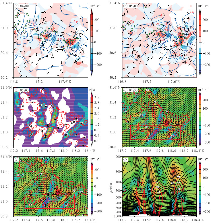 图 11 2023年5月27日(a,b)实况地面风场(风羽)、散度(填色)、10 min变压(蓝色等值线,单位:hPa)和10 min降水量≥5 mm的站点(圆点),WRF-EnKF模拟的(c)最大反射率(红色等值线,单位:dBz)和地面10 min变压(填色),(d)最大反射率(红色等值线,单位:dBz)、地面散度(填色)和风场(风羽),(e)05:00最大反射率(红色等值线,单位:dBz)、04:50地面散度(填色)和风场(风羽),(f)05:00 40 dBz以上反射率(红色等值线,单位:dBz)、04:50 40 dBz以上反射率(黑色等值线,单位:dBz)、散度(填色)和u-w沿31.0°N的垂直剖面 注:图d中D1、D2代表地面辐散区,图f中1、2、C分别代表三条对流柱。 Fig. 11 (a, b) Observed surface wind (barb), divergence (colored), 10 min pressure change (blue contour, unit: hPa) and the stations of 10 min precipitation ≥5 mm (dots), (c) maximum reflectivity (red contour, unit: dBz) and 10 min pressure change (colored), (d) maximum reflectivity (red contour, unit: dBz), surface divergence (colored) and wind (barb), (e) maximum reflectivity (red contour, unit: dBz) at 05:00 BT, surface divergence (colored) and wind (barb) at 04:50 BT and (f) vertical profile of reflectivity ≥40 dBz (red contour, unit: dBz) at 05:00 BT, reflectivity ≥40 dBz (black contour, unit: dBz), divergence (colored) and u-w at 04:50 BT along 31.0°N simulated by WRF-EnKF on 27 May 2023 |
