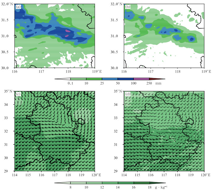 图 5 2023年5月27日(a)03:00—06:00、(b)04:00—05:00 WRF-EnKF模拟的累计降水量,05:00 (c)实况和(d)WRF-EnKF模拟的850 hPa比湿(填色)、风场(风羽) Fig. 5 (a, b) Accumulated precipitation simulated by WRF-EnKF from (a) 03:00 BT to 06:00 BT and (b) 04:00 BT to 05:00 BT, and (c) observation and (d) simulation of specific humidity (colored) and wind (barb) at 850 hPa at 05:00 BT 27 May 2023 |