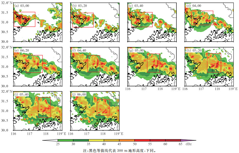 从实况回波的发展演变来看:5月27日03:00,大别山区到江南北部有一条西北—东南走向的带状对流带,其中镶嵌着多个多单体对流风暴并沿着对流带向东南方向移动,此时对流的组织化程度并不高(图 3a);多单体风暴A在东移过程中逐渐分裂成两部分,前部于04:00前后在沿江中部地区发展成短对流1(图 3d),后部与多单体风暴B结合并于04:18在B头部发展成短对流2(图 3e),两条短对流分别于04:42(图 3f)和05:00(图 3g)前后发展到最强,中心强度均超过50 dBz,超过50 dBz的回波长度均在30 km左右;此后,短对流在东移过程中不断减弱,06:00前后线状结构逐渐消失(图 3j),短对流1大约维持了2 h,短对流2大约维持了100 min。