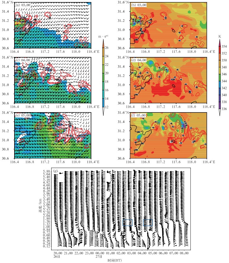 图 7 2023年5月(a~f)27日WRF-EnKF模拟的850 hPa(a,c,e)反射率(红色等值线,单位:dBz)、全风速(填色)、风场(风羽)和(b,d,f)反射率(红色等值线,单位:dBz)、假相当位温(填色), (g)26日20:00至27日08:00池州风廓线雷达反演的水平风场的垂直分布 注:蓝框指示风速增强时间。 Fig. 7 (a, c, e) Reflectivity (red contour, unit: dBz), wind speed (colored), wind (barb) and (b, d, f) reflectivity (red contour, unit: dBz), θse (colored) at 850 hPa simulated by WRF-EnKF on 27 May, (g) vertical distribution of horizontal wind field inverted by Chizhou Wind Profile Radar from 20:00 BT 26 to 08:00 BT 27 May 2023 |