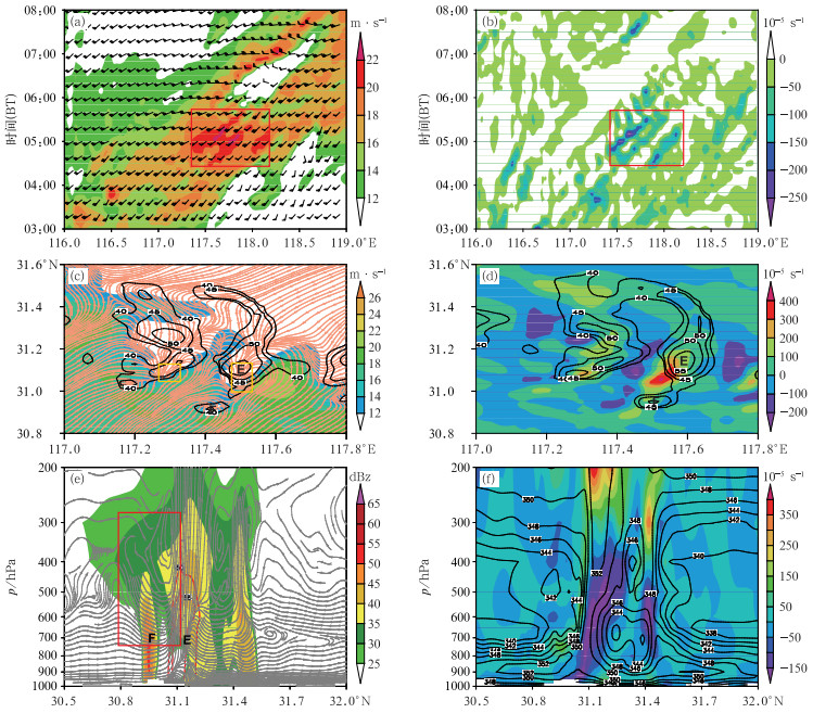 图 8 2023年5月27日WRF-EnKF模拟的(a,b)03:00—08:00 850 hPa(a)全风速(填色)、水平风场(风羽)沿30.9°N和(b)散度沿31.0°N的纬向演变, (c)04:20反射率(黑色等值线,单位:dBz)、850 hPa全风速(填色) 和滤波后的流场(红色流线),(d)04:30反射率(黑色等值线,单位:dBz)和04:20 850 hPa涡度(填色), (e)04:30反射率(填色)、04:20 50 dBz以上反射率(红色等值线,单位:dBz)和v-w沿117.5°E的垂直剖面,(f)04:20散度(填色)和假相当位温(黑色等值线,单位:K)沿117.5°E的垂直剖面 注:图c中黄色方框区域代表γ中尺度气旋性涡旋; 图c~e中E、F分别代表对流单体,下同。 Fig. 8 (a, b) Zonal evolution of (a) wind speed (colored) and wind field (barb) along 30.9°N and (b) divergence along 31.0°N at 850 hPa from 03:00 BT to 08:00 BT, (c) reflectivity (black contour, unit: dBz), wind speed (colored) and flow field after filtering (red streamline) at 850 hPa at 04:20 BT, (d) reflectivity (black contour, unit: dBz) at 04:30 BT and vorticity (colored) at 850 hPa at 04:20 BT, (e, f) vertical profile of (e) reflectivity (colored) at 04:30 BT and reflectivity ≥50 dBz (red contour, unit: dBz) and v-w at 04:20 BT, and (f) divergence (colored), θse (black contour, unit: K) at 04:20 BT along 117.5°E simulated by WRF-EnKF on 27 May 2023 |
