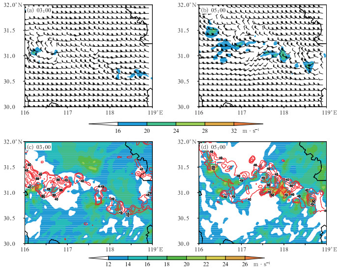 26日20:00安庆站探空(图略)显示6 km高度大概在500 hPa附近,以500 hPa高度代替6 km计算0~6 km垂直风切变。从对流的组织化发展来看,27日03:00,苏皖地区500 hPa高度以槽后西北气流为主,风速整体较弱(图 9a),对应的0~6 km垂直风切变也较弱(图 9c),此时对流的组织化程度不高;05:00,短对流的南部偏北风速超过22 m·s-1(图 9b),地面为偏东风,0~6 km垂直风切变超过26 m·s-1(图 9d),此时短对流发展到最强,组织化程度也达到最高。