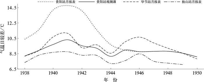 贵州气象档案馆存有贵阳站建站以来完整的气象观测月报表,1937年以来的气象观测记录薄(部分缺失),以及1940年4月13日至6月24日的天气报告明文存根。图 2是用月报表数据建立的1921—2023年最高、最低气温及气温日较差序列。经过滑动t检验、SNHT等方法检测发现:1937年、1944年、1999年3个序列出现断点,其中1938—1944年的气温日较差和1940—1943年的最高、最低气温,与序列均值比较差异显著,差值接近或高于序列3倍标准差。对比表 1,1999年断点是迁站导致,2000年后气温偏低与站址变动相符,1937年、1944年断点与站址变动不符,因此,必须考证1938—1944年贵阳站气象观测月报表中,最低气温显著偏低、最高气温偏高的正确性。这里用贵阳站多源气温观测记录和同期多站气温日较差比对考证,表 2是贵阳站1940年5月观测薄、月报表和天气报3种气温记录统计结果(档案中只有1940年5月有完整天气报文),月报表中气温与天气报一致性很差,最低气温完全不一致,两者最大差值为9.1℃,平均误差为4.6℃,观测薄中气温与天气报一致性高,最低气温两者一致率为87%,两者最大差值为1.1℃,平均误差为0.2℃。图 3展示了贵阳站1940年5月12日观测薄、天气报存根(华氏温度)与手工抄录5月月报表的扫描图像例证,天气报存根中的华氏温度换算为摄氏温度,最高气温为26.5℃、最低气温为17.5℃,与观测薄中18时最高气温26.5℃和07时最低气温17.5℃一致,与月报表中12日第四列最高气温27.2℃、第三列最低气温13.0℃不一致。图 4是1938—1950年贵阳站、独山站、毕节站同期气温日较差序列,图中反映出贵阳站观测薄气温日较差与独山站、毕节站气温日较差变化一致,日较差大小与地理纬度相符(独山位于贵阳东南,毕节位于贵阳西北),而1938—1944年月报表记录与独山站、毕节站差异大,也与地理位置不符。因此,1938—1944年贵阳站月报表中的日最高、最低气温数据不宜用于百年序列构建,构建本序列改用观测薄记录数据。