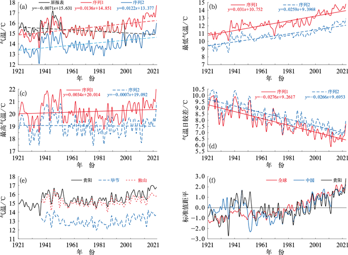 图 6 1921—2023年贵阳(a)气温,(b)最低气温,(c)最高气温,(d)气温日较差序列1和序列2,(e)1937—2020年贵阳站、毕节站、独山站气温,(f)1921—2023年贵阳、中国、全球气温标准值距平(以1970—1999年为基准值) Fig. 6 Guiyang temperature series 1 and series 2 from 1921 to 2023: (a) temperature, (b) minimum temperature, (c) maximum temperature, (d) diurnal temperature range, (e) temperature series of Guiyang, Bijie and Dushan stations from 1937 to 2020, (f) standard value anomaly of temperatures in Guiyang, China and the whole globe from 1921 to 2023 (with 1970-1999 as the base period) |