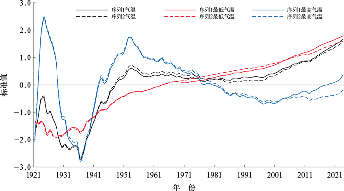 为了评估贵阳站近百年气温序列1、序列2的代表性,利用国家气候中心1951—2020年全国评估气温变化数据、近3年国家气候公报及唐国利和林学椿(1992)研究成果,构建1921—2023年全国气温序列,并与全球气温(https://www.ncei.noaa.gov/data/global-summary)同期序列对比,分析与贵阳站序列1和序列2的相关性,相关系数见表 6。同时,以1970—1999年均值为基准值(该时期观测仪器规格和规范与全国一致),做各序列标准值距平(图 6f),结果表明贵阳气温变化与全球气温变化有较好的一致性,其中1950—1953年是中国气温与全球和贵阳气温差异最大的时期。