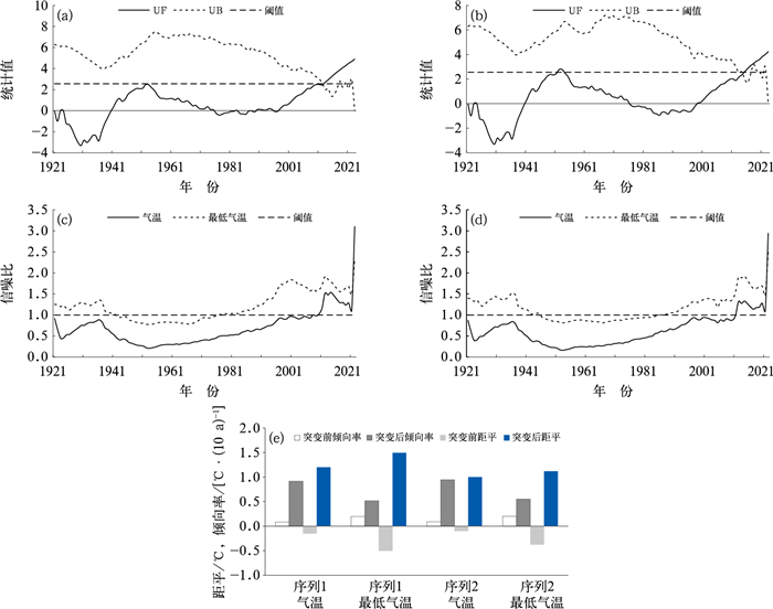 图 8 1921—2023年贵阳站(a, c)序列1、(b, d)序列2的(a, b)气温M-K检验, (c, d)气温和最低气温信噪比检验, (e)2个序列气温和最低气温突变前后累年均值距平及变化倾向率 Fig. 8 Statistical tests of temperature series at Guiyang Station from 1921 to 2023:(a, b) M-K test for temperature, (c, d) SNR test for temperature and minimumtemperature of (a, c) series 1 and (b, d) series 2, (e) cumulative annual meanvalue anomalies and tendency rates before and after the abrupt change intemperature and minimum temperature for series 1 and series 2 |