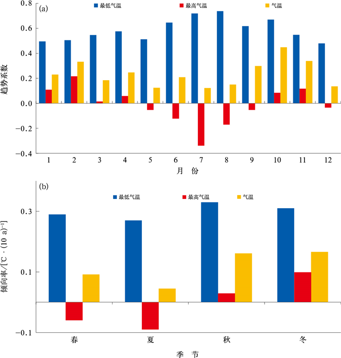 图 9为1921—2023年贵阳百年气温序列1的月变化趋势系数、季节变化倾向率。最高气温变化仅2月升温趋势和7月降温趋势分别通过了0.05和0.01的显著性水平检验;气温升温趋势在降水或雨日偏多的3月、5月、7月、8月及12月,未通过0.05显著性水平检验,1月、4月和6月,通过0.05显著性水平检验,在降水或雨日偏少的2月、9月、10月及11月,通过了0.01显著性水平检验,可见降水对气温、最高气温升温速率有一定程度的调节作用。全年最低气温升温均通过了0.01显著性水平检验,由于最低气温多出现在夜间,季节更替与降水都没有影响其明显的升温趋势,升温应是非自然因素所致。季节上,最低气温四季升温显著;气温在秋、冬季升温明显,夏季是贵阳近百年来气温变化最小的季节;最高气温季节变化不明显。