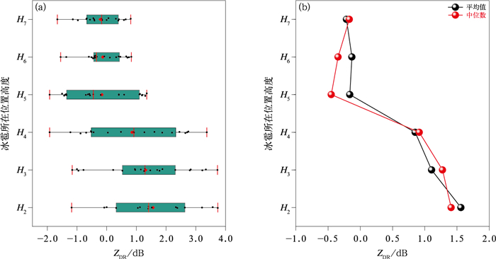 分析22例冰雹样本在7个高度(表 3)上的ZDR值的分布(图 1a)。在-10℃层及以上(H6、H7),ZDR值为-1.66~0.83 dB,ZDR值集中分布在零值附近,这与刘黎平等(1996)、曹俊武和刘黎平(2006)提出的冰雹在下落过程中不断摆动翻滚,雷达采样体积内总体接近球形分布的结论一致。