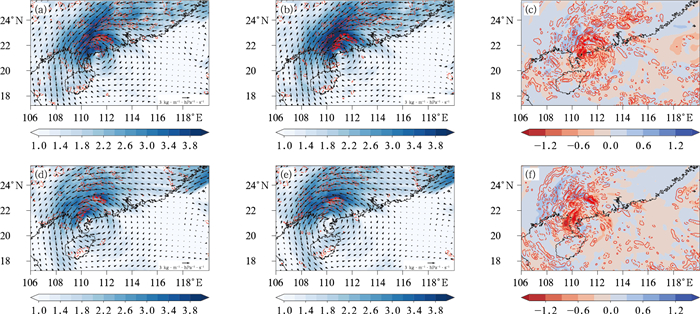图 11 2023年9月2日(a~c)12时和(d~f)18时850 hPa水汽通量(矢量和填色,单位:kg·m-1·hPa-1·s-1)及水汽通量散度(红色等值线,单位:10-5 kg·m-2·hPa-1·s-1) (a, d)CTL,(b, e)BDS,(c, f)BDS和CTL之差 Fig. 11 The 850 hPa water vapor flux (vector and colored, unit: kg·m-1·hPa-1·s-1) and water vapor flux divergence (red contour, unit: 10-5 kg·m-2·hPa-1·s-1) of (a, d) CTL, (b, e) BDS and (c, f) difference between BDS and CTL at (a-c) 12:00 UTC 2 and (d-f) 18:00 UTC 2 September 2023 |
