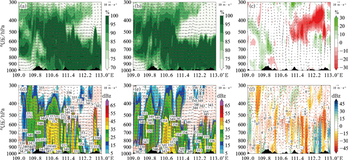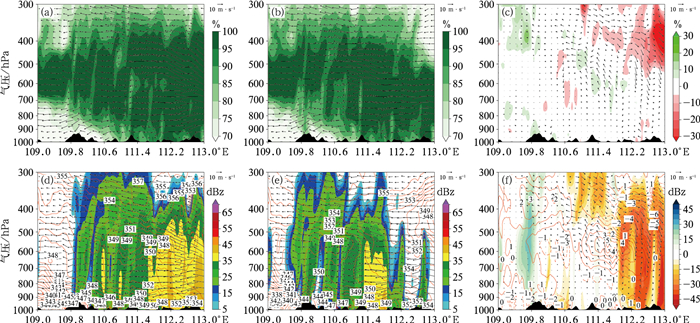 垂直速度直接反映了大气垂直运动情况,上升运动通常与云的形成和降水有关,下沉运动则可能抑制降水的发生发展。相对湿度可以反映大气中水汽的饱和程度,高相对湿度结合上升运动,有利于降水的发展。对CTL空报区做垂直剖面,比较两组试验在该处的降水发展条件,分析CTL产生空报的原因。由图 12d和13d可见,降水系统自东向西移动。在9月2日06时112°~113°E区域内,CTL中有倾斜上升运动(图 12d),95%以上的相对湿度伸展到400 hPa,形成深厚的湿层,相当位温达到350 K以上,整层高温、高湿,使得对流发展旺盛。而在BDS中(图 12e),相对湿度95%以上区域仅伸展到500 hPa,垂直速度相对较小,在450 hPa形成了相当位温低值区,BDS相较CTL,空气更为干冷、对流更弱(图 12f),不利于降水的发生,从而改善了由于未同化北斗探空而在此处出现的降水空报现象。2日12时,强降水系统边缘西移至110°E附近(图 13d,13e),回波强度达40 dBz以上。111°E以东,BDS在500 hPa高度上存在相对湿度小于70%的相对干区,对应着相当位温的低值区,在500 hPa以下相当位温等值线密集且随着高度减小,大气层结不稳定,伴随着高湿大气的上升运动,存在着小型对流系统的发展。在111.5°E附近,CTL水汽更充沛、湿层深厚、上升运动更强,有利于降水发展(图 13f)。