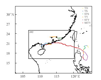 图 2 模拟区域、北斗探空资料分布及台风路径 注:红色、蓝色、黄色、绿色圆圈实线分别表示阳江、清远、河源、汕头站施放的气球运行轨迹;彩色点线为台风移动路径,不同颜色表示不同台风强度等级;d02方框为试验嵌套模拟区域。 Fig. 2 Simulated area, distribution of Beidou sounding data, and typhoon path |