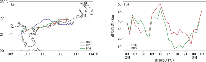 图 6为观测与同化试验预报的台风路径以及路径预报误差。观测实况显示,9月2日00时“苏拉”位于广东中部以南海域,并随着时间不断西移,随后向西南方向移动,出海后消亡(图 6a)。两组同化试验模拟的台风中心初始位置位于实况北侧,有一定初始误差,预报过程前期两者都向西南移动,与实况位置逐渐接近,之后二者均向南移动并逐渐远离实况,但相对而言,BDS相较CTL更接近实况。图 6b显示,起报后12 h内,两组试验路径误差相差不大(均为40 km左右),二者路径预报误差均在2日12时达到最大,随后减小且BDS预报误差下降更快。