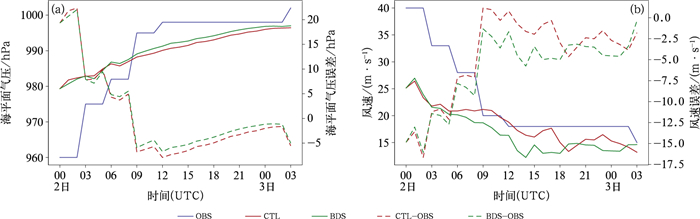3.1.2 强度预报台风中心附近海平面最低气压和最大风速可有效表征台风强度,也是检验强度预报准确度的重要指标。图 7为观测与模式模拟的台风中心附近海平面最低气压和最大风速变化及其预报误差。结合图 6可知,9月2日00时“苏拉”即将登陆,海平面气压由960 hPa开始不断升高,最大风速逐渐减小,台风强度开始减弱。两组试验都模拟出中心海平面气压升高的趋势(图 7a),BDS模拟的海平面气压在9~24 h预报时效内较CTL更接近实况,其误差更小。由于强度误差存在负值,因此计算其平均绝对误差。BDS海平面最低气压预报的平均误差为6.16 hPa,比CTL的6.89 hPa减少了0.73 hPa;BDS预报的海平面最低气压的均方根误差为8.22 hPa,较CTL的8.73 hPa改善了5.84%(表略)。
