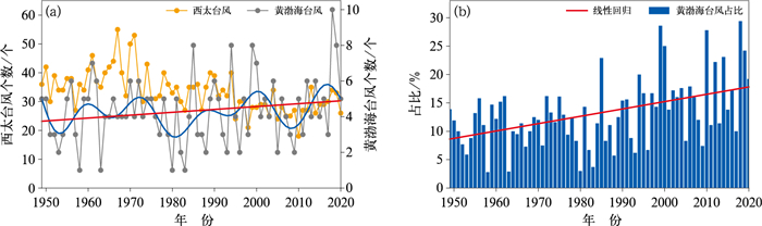 图 2 1949—2020年(a)西太台风和黄渤海台风个数以及(b)黄渤海台风在西太台风中的占比 注:图a中蓝色曲线和红色直线分别为黄渤海台风年个数的10 a低通滤波曲线和线性回归趋势。 Fig. 2 (a) The annual distribution of WNP TCs and HBS TCs, and (b) the percentage of HBS TCs in WNP TCs during 1949-2020 |