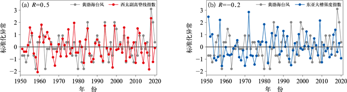 图 3 1951—2020年6—9月平均的黄渤海台风数与(a)西太副高脊线指数和(b)东亚大槽强度指数的标准化异常 Fig. 3 The standardized anomaly sequences for the number of HBS TCs with (a) the subtropical high ridge line index and (b) the East Asian trough intensity index from June to September during 1951-2020 |