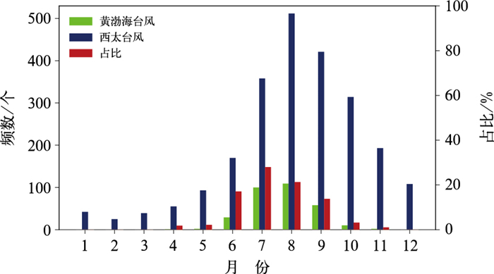 分别统计西太和黄渤海台风在各月的生成频数,并将二者进行对比(图 4)。由图可见,西太台风在全年均有生成,其中8月最多(512个),9月次之(421个)。黄渤海台风仅在4—11月生成,同样8月最多(109个),而7月次之(100个)。6月前和9月后,黄渤海台风迅速减少。一年内台风进入黄渤海的最早日期为2003年的4月25日(0302号台风“鲸鱼”),最晚为2019年的11月24日(1927号台风“凤凰”)。综上所述,盛夏(7—8月)为黄渤海台风活动鼎盛期,春季、秋季的黄渤海台风明显减少。