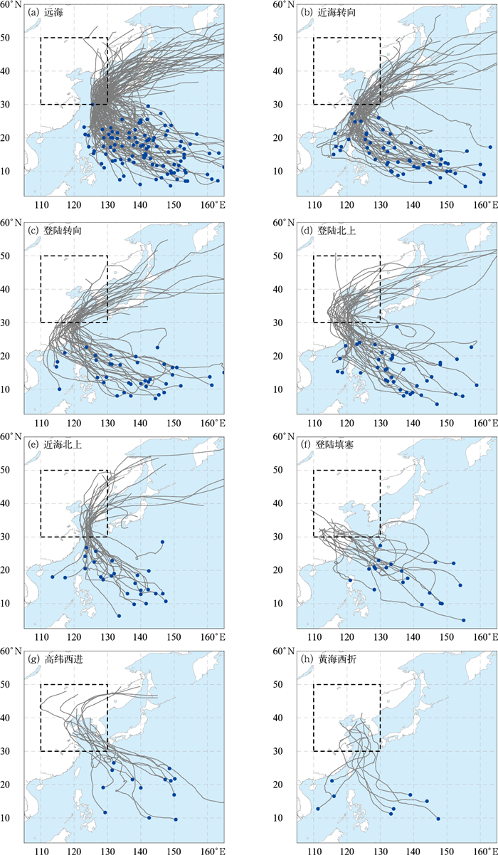 图 8 1949—2020年黄渤海区域各类台风移动路径(灰色实线) 注:蓝色圆点为台风生成位置。 Fig. 8 Tracks (grey solid line) of HBS TCs during 1949-2020 |