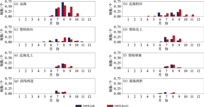 图 9 1990年前后年平均的黄渤海台风各类移动路径的逐月出现频数 Fig. 9 The monthly occurrence frequency of HBS TCs tracks annual average before and after 1990 |
