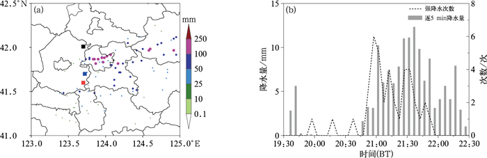 图 1 2023年8月4日抚顺短时暴雨过程(a)19:00—23:00累计降水量(彩色圆点)的空间分布,(b)19:30—22:30强降水(5 min降水量超过10 mm)次数和累计降水量最大站点的逐5 min降水量的时间演变 注:图a中黑色、红色和蓝色方块分别示意SC多普勒天气雷达、X波段相控阵雷达和风廓线雷达。 Fig. 1 (a) Distribution of accumulated precipitation from 19:00 BT to 23:00 BT (colored dot) and (b) time series of frequency of 5 min precipitation >10 mm and 5 min precipitation at the station with maximum accumulated precipitation from 19:30 BT to 22:30 BT during short-time rainstorm in Fushun on 4 August 2023 |