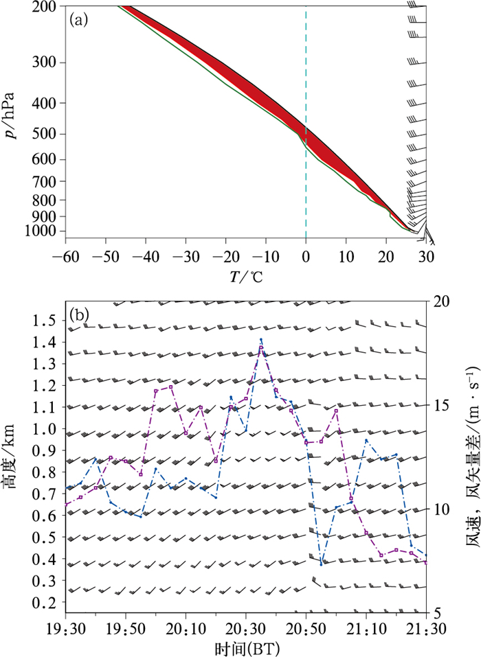 图 3 2023年8月4日(a)19:00抚顺T-lnp图,(b)19:30—21:30沈阳风场(风羽)、1 km以下最大风速(蓝线)和0~1 km风矢量差(紫线)的时间演变 Fig. 3 (a) The skew T-lnp diagram in Fushun at 19:00 BT and (b) time series of wind field (barb), maximum wind speed below 1 km height (blue line) and the 0-1 km wind vector difference (purple line) at Shenyang from 19:30 BT to 21:30 BT 4 August 2023 |
