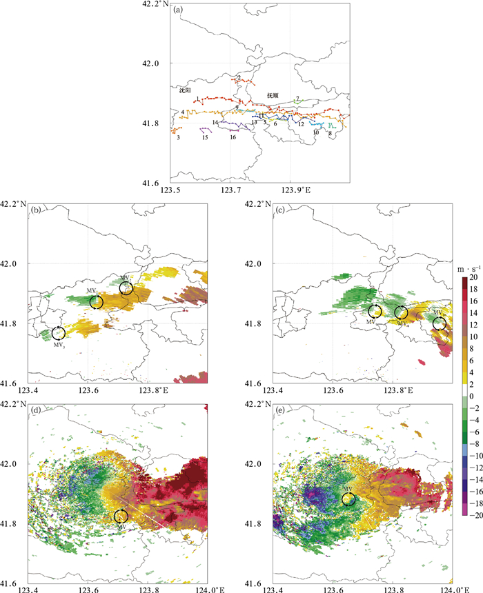 3.2 MV的总体特征以往研究证实X波段相控阵雷达衰减问题对径向速度的影响较小(苏永彦和刘黎平,2022),因此分钟级的径向速度资料能够精细表征降水系统内的动力结构,尤其是观测到该风暴内共出现了16个尺度在2~20 km的MV(图 5a)。其中图 5b,5c为两个典型时刻径向速度,结合相应(或最临近)时刻的SC雷达监测到的反射率因子(图略)可见,这些MV镶嵌在降水系统内、相互独立。SC雷达仅能观测到单个MV(图 5d,5e),观测到MV的个数少于X波段相控阵雷达,同时SC雷达的时间分辨率为6 min,对MV观测的连续性也更差。因此在X波段相控阵雷达有效探测范围内,可利用其径向速度资料分析降水系统动力结构, 尤其是MV的精细化观测特征。