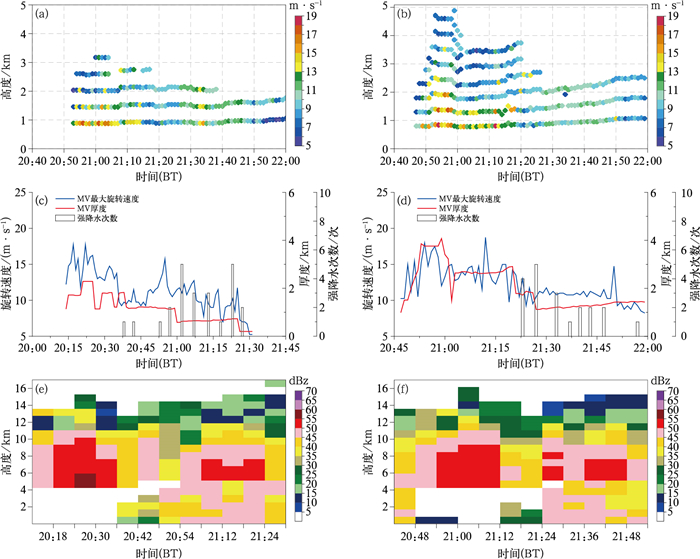 在RMV旋转最强阶段,其上方3 km以上存在强回波(图 7e,7f)。通常用40 dBz的回波的伸展高度来表征上升气流的高度(Zipser et al,2006),此阶段,大于40 dBz的回波伸展到9 km,这是极强风暴才具有的回波顶高(Liu and Zipser, 2015),9 km处环境温度为-20℃,因此MV上空的风暴内存在冰相降水粒子。以上特征说明强烈旋转的RMV形成强上升气流,因此导致其上方出现浓度高、相态复杂的降水粒子,但是上升气流能够支撑这些降水粒子,所以RMV附近并没有出现强降水。随后,RMV旋转减弱,产生的上升运动强度减弱,当无法支撑其上方降水粒子时,前期RMV上空的降水粒子下落到地面,因此MV上空回波存在快速下降的现象,导致RMV附近出现多次强降水事件。另外也需要注意,RMV并没有迅速消亡,也存在旋转速度波动性增加的现象。