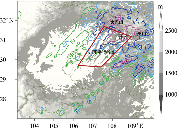 图 1 2021年6月17日14:00至18日14:00累计降水量(彩色等值线,单位:mm)分布 注:红框代表平行岭谷区域,开州为暴雨中心点,灰色填色为地形。 Fig. 1 Distribution of the accumulated precipitation (colored contour, unit: mm) from 14:00 BT 17 to 14:00 BT 18 June 2021 |
