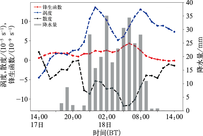 图 10为大巴山南麓大暴雨中心开州站小时降水量、925 hPa锋生函数、散度和涡度的时间演变。可以看出,降水发生前,大巴山南麓有弱的边界层锋生和辐合,并伴随有正涡度增长。17日23:00,边界层辐合和正涡度均明显增大,降水快速增强,此后边界层辐合和锋生进一步增强,并有较强的正涡度维持。18日06:00,辐合和锋生都达到最强,降水发展强盛; 08:00后,边界层辐合和锋生均快速减弱,降水也明显减弱。