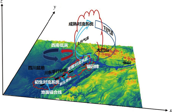 图 11 2021年6月17—18日大巴山和平行岭谷地形下大暴雨事件的概念模型 Fig. 11 Conceptual model of the heavy rainfall event over Daba Mountain and the parallel ridge-valley topography from 17 to 18 June 2021 |