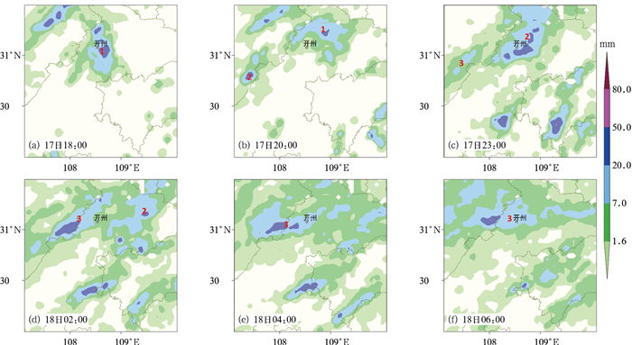 图 2 2021年6月17—18日小时降水量 注:数字为雨团(雨带)编号。 Fig. 2 Hourly precipitation from 17 to 18 June 2021 |