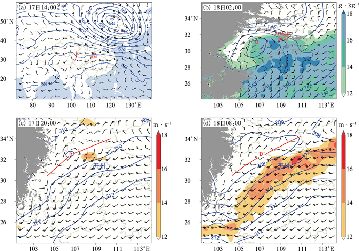 图 3 2021年6月17—18日风场(风羽)及(a)500 hPa高度场(等值线,单位:dagpm),(b)850 hPa高度场(等值线,单位:dagpm)和比湿(填色),(c,d)700 hPa高度场(等值线,单位:dagpm)和西南急流(填色) 注:D代表低压中心;图a中红色短线代表低槽;图b中灰色阴影为1500 m以上地形;图c和图d中灰色阴影为3000 m以上地形,红色实线代表切变线。 Fig. 3 (a) The 500 hPa height field (contour, unit: dagpm) and wind field (barb), (b) 850 hPa height field (contour, unit: dagpm), wind field (barb), and specific humidity (colored), (c, d) 700 hPa height field (contour, unit: dagpm), wind field (barb), and southwesterly jet (colored) from 17 to 18 June 2021 |