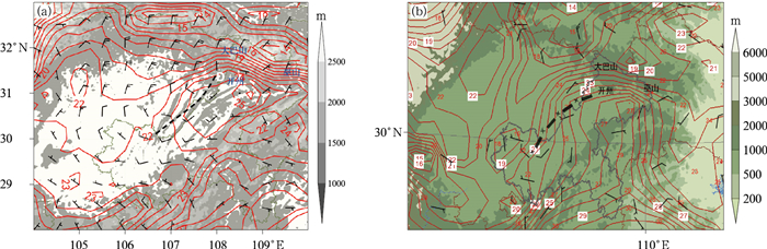 中尺度抬升机制是强天气触发的必要条件,局地强天气往往发生在地面中尺度辐合线和锋面附近(王坚红等,2017;徐珺等,2018;雷蕾等,2020;李琴和邓承之,2021)。考虑大巴山脉和平行岭谷地形复杂,因此有必要对ERA5再分析资料与实况资料进行对比以确认再分析资料的适用性,选取17日20:00的ERA5再分析资料(图 5a)的10 m风场和2 m温度场与实况资料(图 5b)进行对比。ERA5再分析资料的2 m温度场整体分布与实况一致,略有1~2℃偏差,大巴山脉等温线密集区与实况基本一致。10 m风场整体表征也较好,四川盆地为偏北风,巫山和长江河谷为高压底部的东北风,表明近地面有浅薄冷空气侵入,另外,地面辐合线与实况位置也较为接近,故ERA5再分析资料可以较好地反映该地区近地面气象要素实际情况。