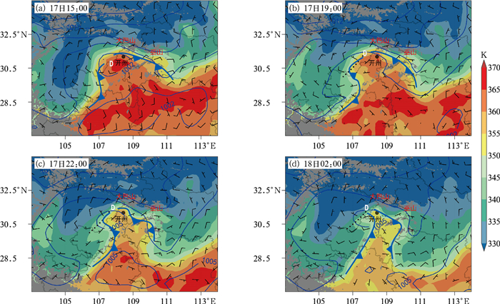 图 6 2021年6月17—18日海平面气压(等值线,单位:hPa)和地面10 m风场(风羽)叠加假相当位温(填色) 注:灰色阴影为1500~3000 m高度地形,D为地面辐合中心,黑色虚线为地面辐合线,蓝色锯齿线为地面冷锋。 Fig. 6 Sea level pressure (contour, unit: hPa) and 10 m wind field (barb) superimposed on the pseudo-equivalent potential temperature (colored) from 17 to 18 June 2021 |