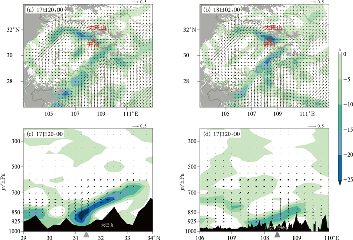 3.3 地形对水汽输送的阻挡和汇聚作用地形对水汽输送有绕流、阻挡和汇聚作用(刘晶等,2019;汪小康等,2020;姚秀萍等,2024)。大暴雨发生前,受地形阻挡作用,水汽在大巴山前堆积,主要集中在700 hPa以下。17日20:00(图 7a),水汽通量散度辐合大值区呈东西向带状分布,位于四川盆地北部边缘,即大巴山前迎风坡处,中心值超过了-20×10-5 g·cm-2·hPa-1·s-1。18日02:00(图 7b),夜间低空急流加强带来更为强劲的水汽输送,大巴山南麓东西向水汽辐合带有所东移,辐合中心值超过-25×10-5 g·cm-2·hPa-1·s-1,使得暴雨区水汽持续处于饱和状态,降水效率高且持续时间长。水汽通量散度剖面显示(图 7c),水汽辐合大值区沿着大巴山脉倾斜分布,850 hPa以下有强的水汽辐合。另外,平行岭谷地区水汽分布呈东北—西南向,走向与地形一致,近东西向水汽辐合带集中在925 hPa或850 hPa以下的边界层(图 7d),也说明地形对水汽输送有阻挡和汇聚作用。