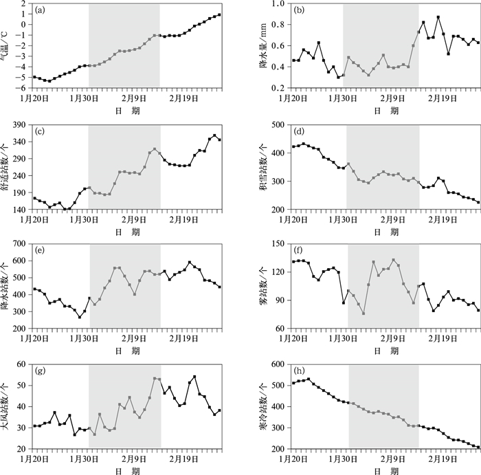 图 4 1991—2020年春节假期全国平均(a)气温,(b)降水量,(c)舒适站数,(d)积雪站数,(e)降水站数,(f)雾站数,(g)大风站数和(h)寒冷站数的平均值逐日变化 注:以灰色阴影划分三个阶段。 Fig. 4 Daily variation of national-averaged (a) temperature, (b) precipitation, (c) comfortable stations, (d) snow cover stations, (e) rainy stations, (f) foggy stations, (g) windy stations, and (h) cold stations during the Spring Festival holiday averaged over 1991-2020 |