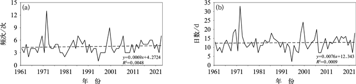 图 7 1961—2023年春节假期(a)冷空气过程频次和(b)日数的历年变化 Fig. 7 Annual variation of (a) frequency and (b) days of cold air processes during the Spring Festival holiday from 1961 to 2023 |