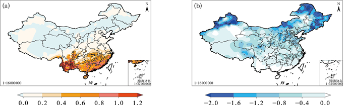 图 8 1961—2023年中国春节假期(a)人体舒适日数和(b)积雪日数的变化趋势空间分布(单位:d/10 a) Fig. 8 Spatial distribution of trends of (a) comfortable days and (b) snow cover days during the Spring Festival holiday from 1961 to 2023 in China (unit: d/10 a) |